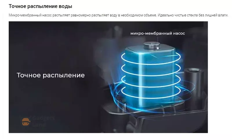 Влажная очистка с достаточным количеством воды наиболее эффективна, робот быстро и качественно очищает стёкла от загрязнений, не оставляя следов, разводов. Робот-мойщик оснащён резервуаром для воды, которая при влажной очистке разбрызгивается вперед по ходу движения робота.
